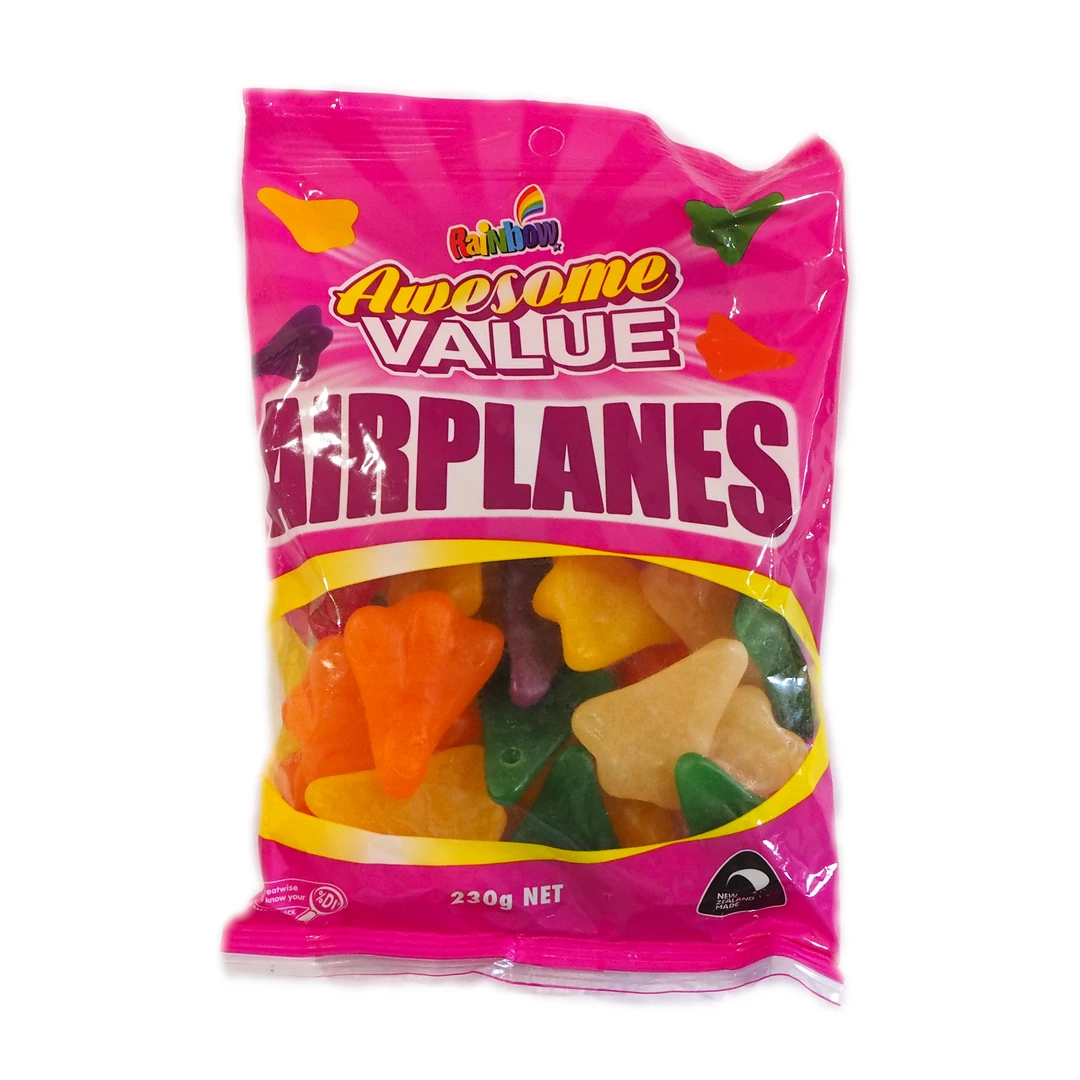 Ingredients (Air planes): Glucose sugar (from corn), sugar, water, thickener (140 from corn), beef gelatine, food acids (330 296), flavours, glazing agents (coconut oil 903) colours (102, 110, 122,133)