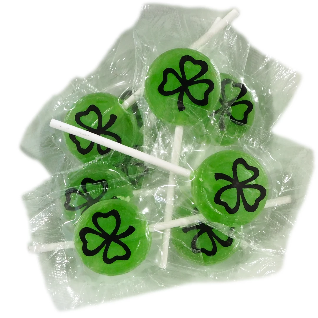 With the luck of the Irish. A great product to use at your next Irish party or St Patricks Day. Green Flat individually wrapped lollipops with the shamrock picture on the packaging (Lollipop is not printed).