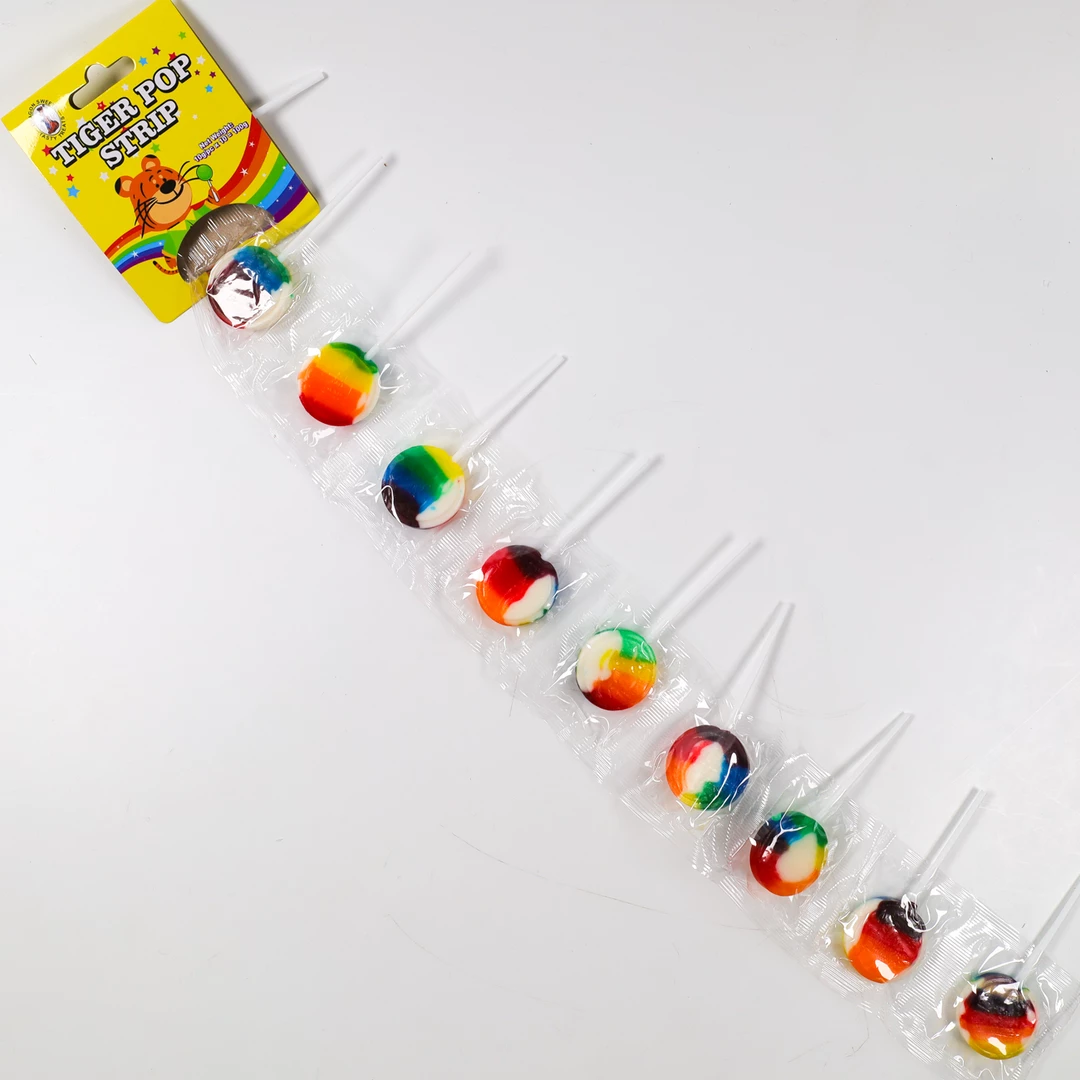 Tiger Pop Strip lollipops. A fun 10 pack strip of rainbow lollipops. These lollipops are great for parties and a great price!